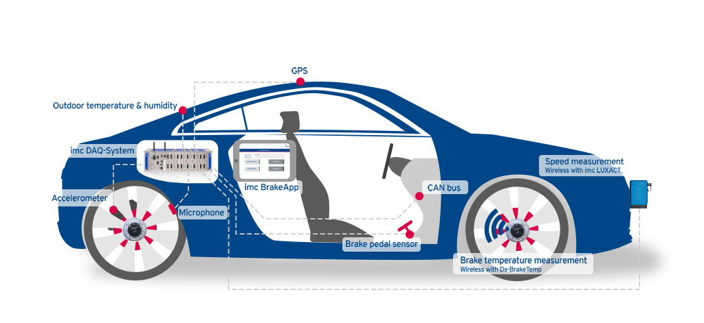 Due to the recuperation of braking energy in electric vehicles, braking systems are structured differently from those in cars with combustion engines. A large part of the braking energy is fed back into the drive battery. This is why the wheel brakes are applied only for comparatively severe manoeuvres or as a redundant safety system. The imc brake measurement system is a comprehensive test solution and consists of a modular data acquisition system that includes optional sensors and wheel telemetry.