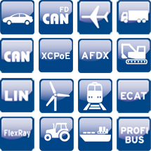 - Automobile: CAN, CAN FD, Flexray, XCPoE, Kistler Roadyn sensor systems