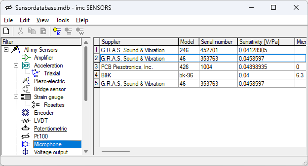 imc SENSORS is a ready-to-go, universal database application for administering and editing sensor information. Along with values for smart sensors defined in IEEE P 1451.4 (TEDS), selections of additional sensor properties can be freely entered. These can be set, edited and viewed in freely configurable tabular views, e.g., the sensor's technical data information, as well as its calibration values.